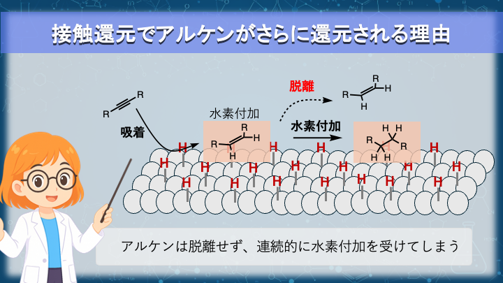アルケンで停止させることが難しい理由は、反応が金属表面上で連続的に進行する構造にあります。