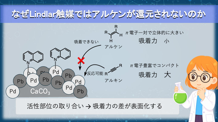 その結果、アルキンは吸着・反応できるが、生成したアルケンは吸着競争において不利となり、表面から脱離しやすくなります。