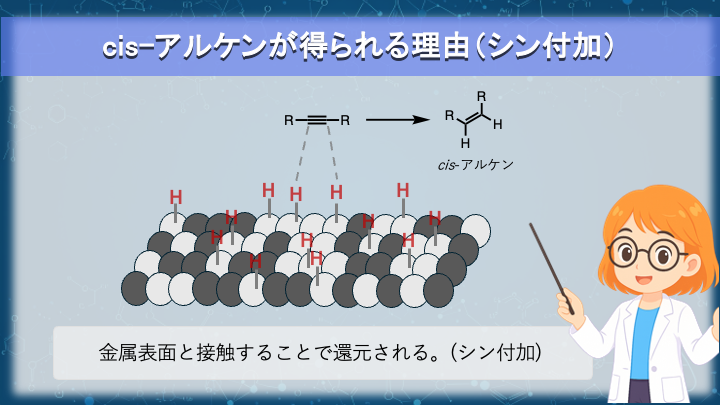 Lindlar触媒でcis-アルケン (シン付加) が得られる理由