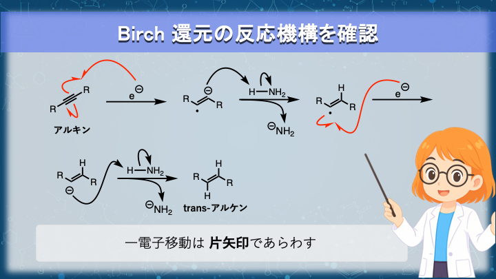 どちらも液体アンモニアに溶解させた金属による一電子還元機構で進行します。