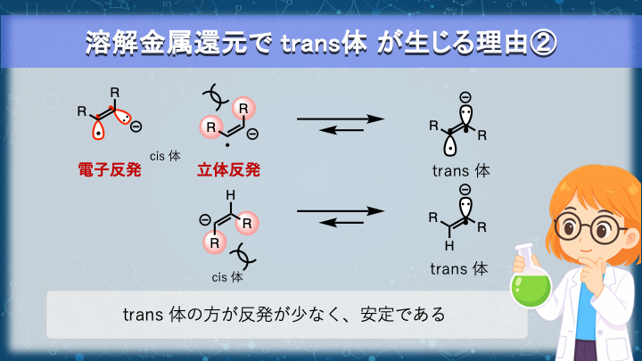 このように、原子団のかさによる立体反発と、ラジカルとアニオンの電子反発の両方がtrans 型を安定化させます。