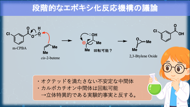 実験的にも、アルケンの置換基配置がエポキシドにそのまま反映される「立体特異的反応」であることが確かめられています。つまり、途中に回転可能なカルボカチオンは存在していない。それが協奏反応である、確かな証拠です。