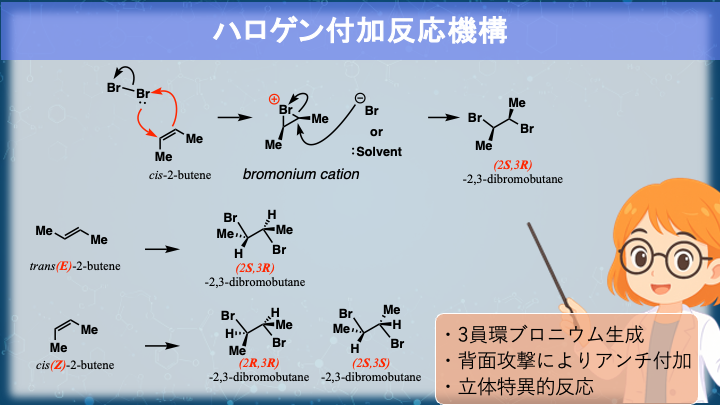 つまり、ハロゲン付加反応の第1段階――ハロニウムイオンの生成――が、“電子の動きが同時に起こる協奏的反応”なんです。そしてこの中間体こそが、立体選択性を決める要の存在なんですね。