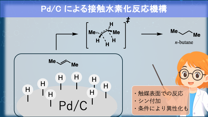 実際に触媒還元を行うと、条件によっては還元が完全に進まず、アルケンの異性化が起こることもあります。化学者たちは、溶媒や触媒(金属の種類や担体)を工夫しながら、反応条件をチューニングしているんですね。