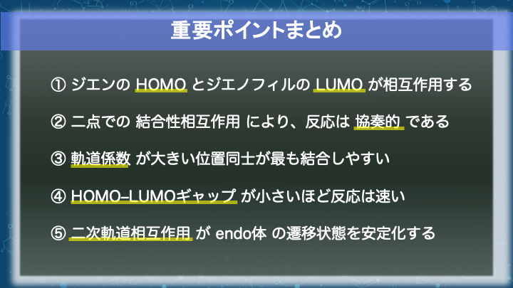 しかし endo 則の本質は、反応点“以外”の部分にも LUMO が広がっている点 にあります。