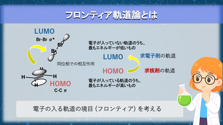 有機反応は最高被占軌道(HOMO)と最低空軌道(LUMO)の重なりで決まる。