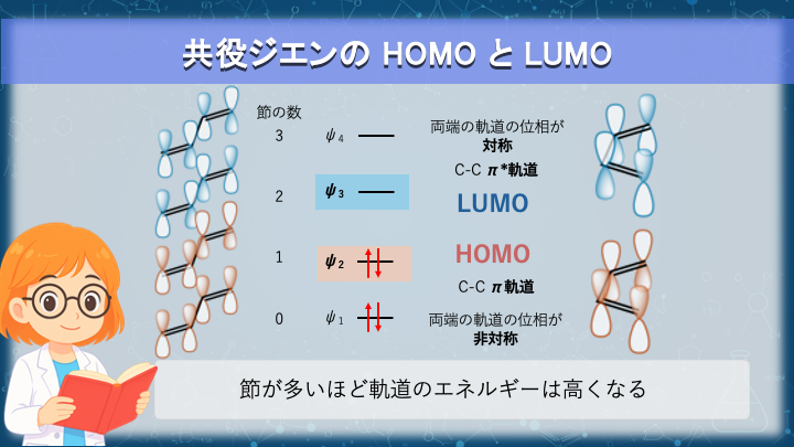 共役ジエンには 4 つの π 軌道(ψ1〜ψ4)があり、HOMO は ψ2 に該当します。