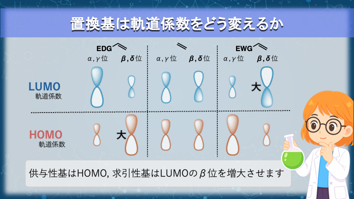 位置選択性は、置換基によって変わる軌道係数(HOMO/LUMO の広がり)で説明できる。
