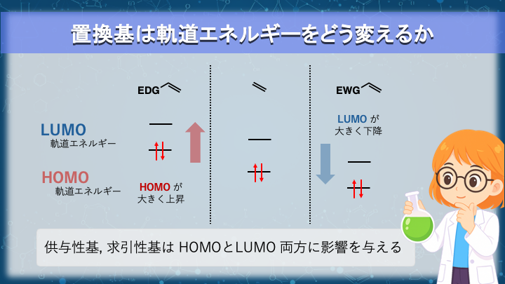 電子供与性基はHOMOを上げ、電子求引性基はLUMOを下げることでエネルギー差が縮まる。