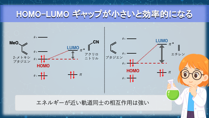 HOMOとLUMOのエネルギー差が小さいと反応はより効率的になる