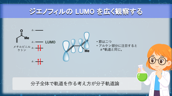 メチルビニルケトンでは、C=C の両端の p 軌道に加えて、
