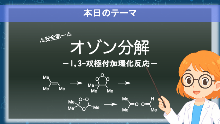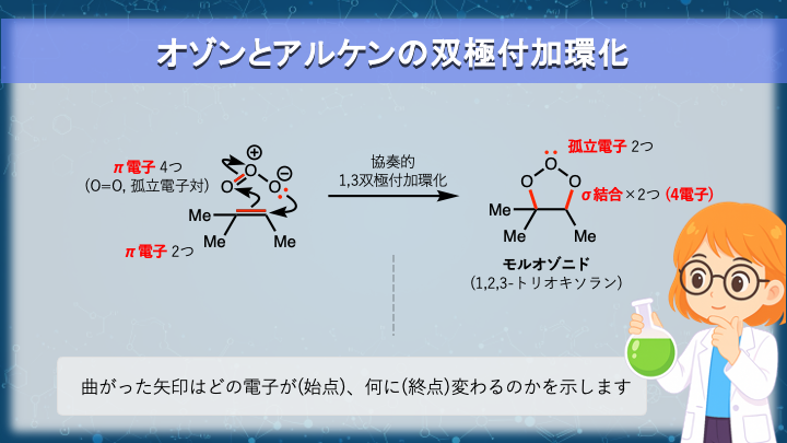 オゾンは1,3-双極子としてアルケンと付加環化反応を起こします。