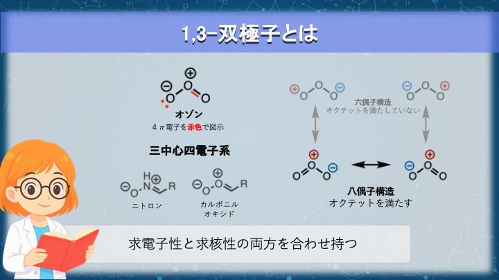 1,3-双極子とは、正と負の電荷を形式的に併せ持つ化学種 です。